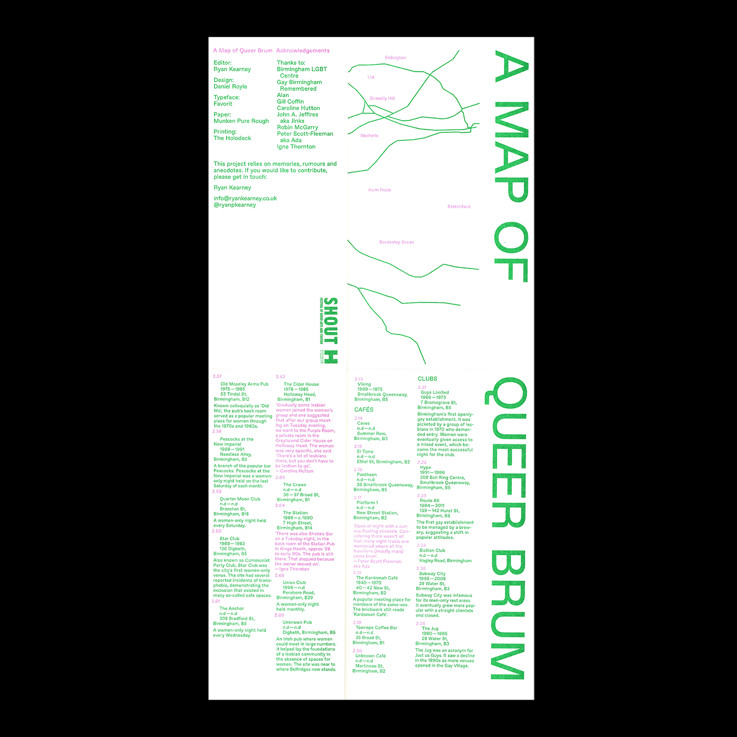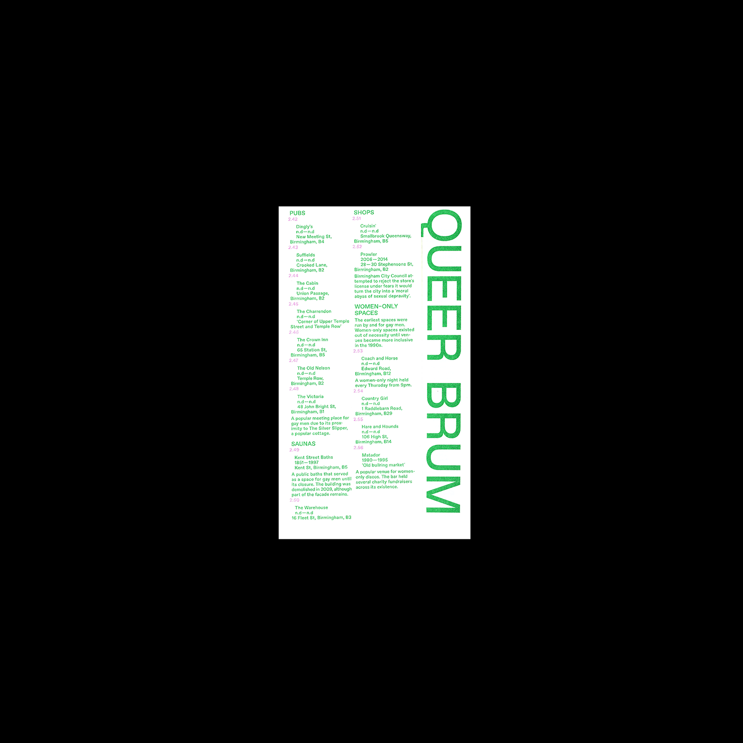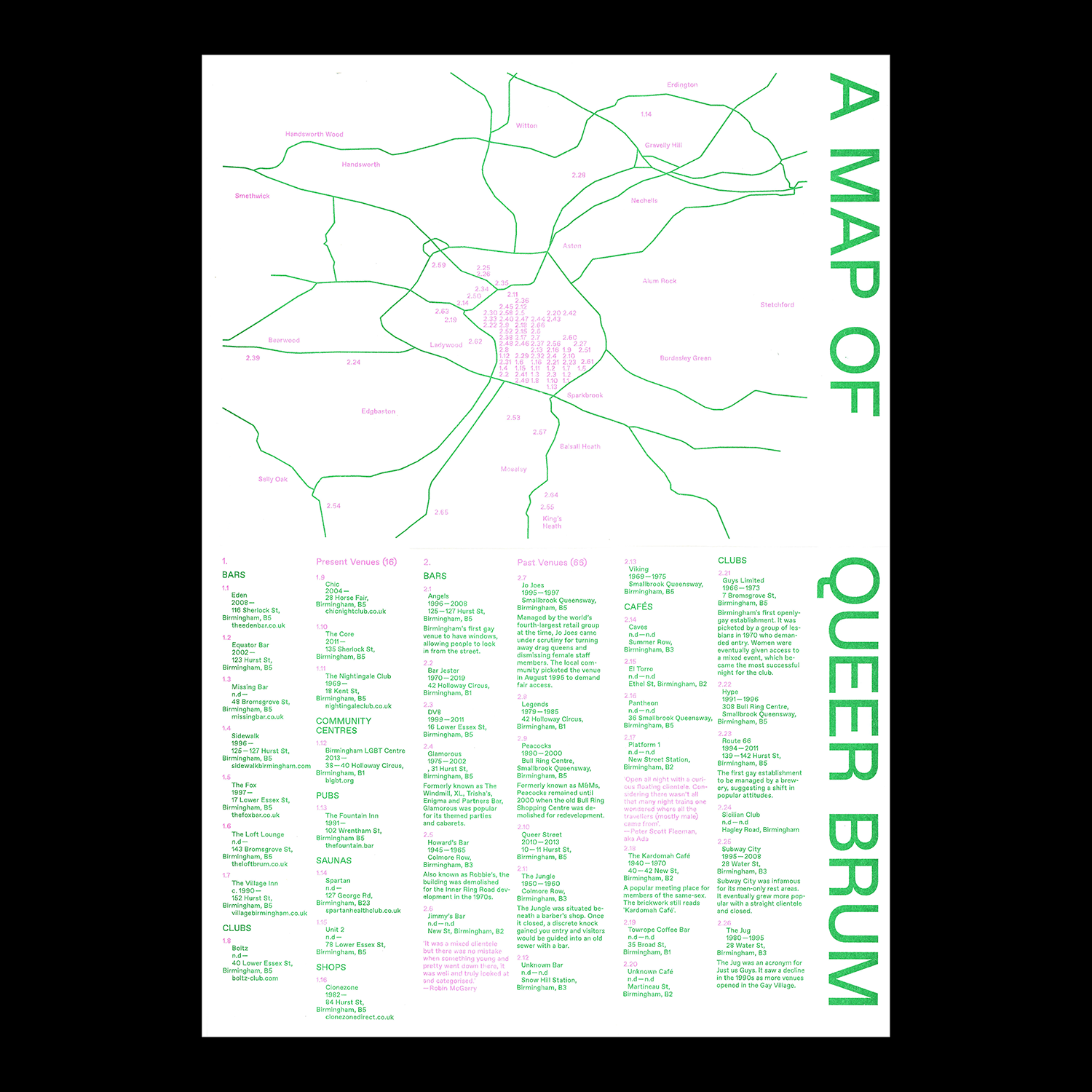 A Map of Queer Brum is a directory of Birmingham’s LGBTQ+ spaces from 1850 to present. It brings together personal and collective descriptions of sites including bars, clubs and public toilets in response to ongoing threats of regeneration.
