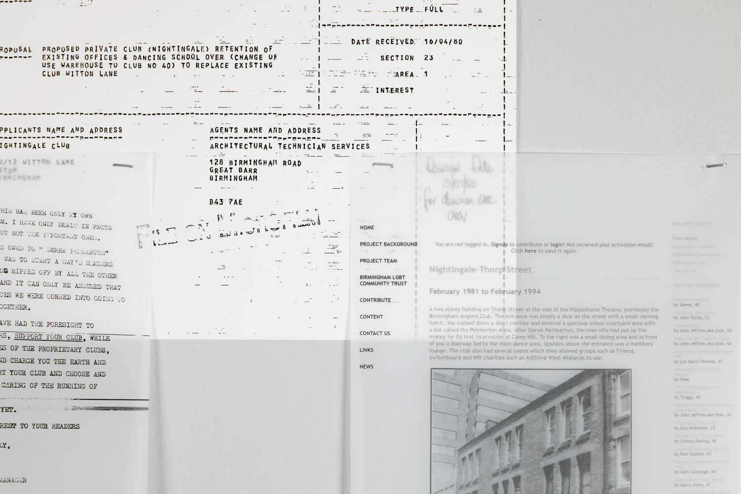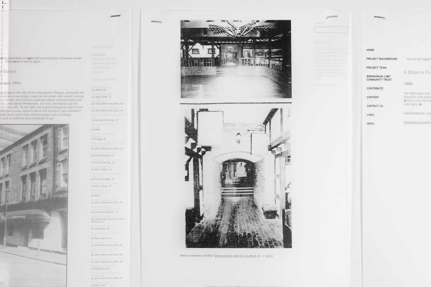 The Nightingale Club’s history centres on narratives of migration and erasure. From a terraced house to an ex-working men’s club, its previous sites faced compulsory purchase orders and rejected applications for expansion. Modelled after a gay village, the club’s third iteration on Thorp Street was purchased by Birmingham Hippodrome in 1994 following ongoing efforts, and was subsequently demolished for their expansion. Merging recollections, personal ephemera and archival material, If Memory Serves re-positions collective narratives upon the site of club’s former foundations.